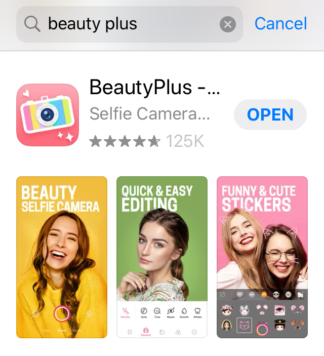 アプリ検索で、英語もしくは日本語で「ビューティープラス」と入力しても出てきます!