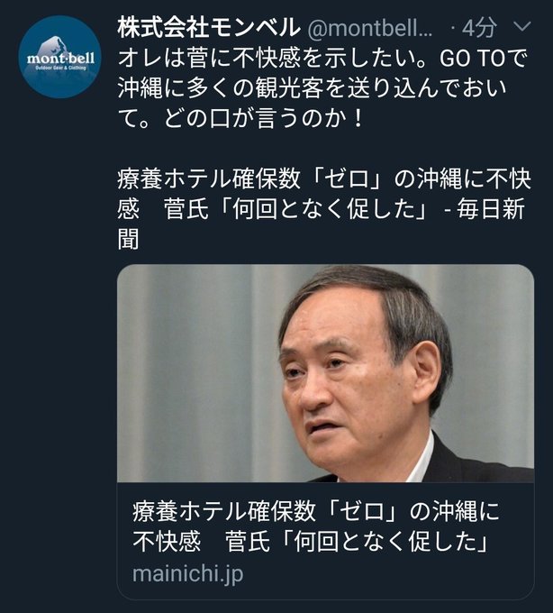 通常のモンベルのツイッターの内容とは大きく違う、政治的な意見を述べた内容。1人称も「オレ」となっており、明らかに違和感があります。