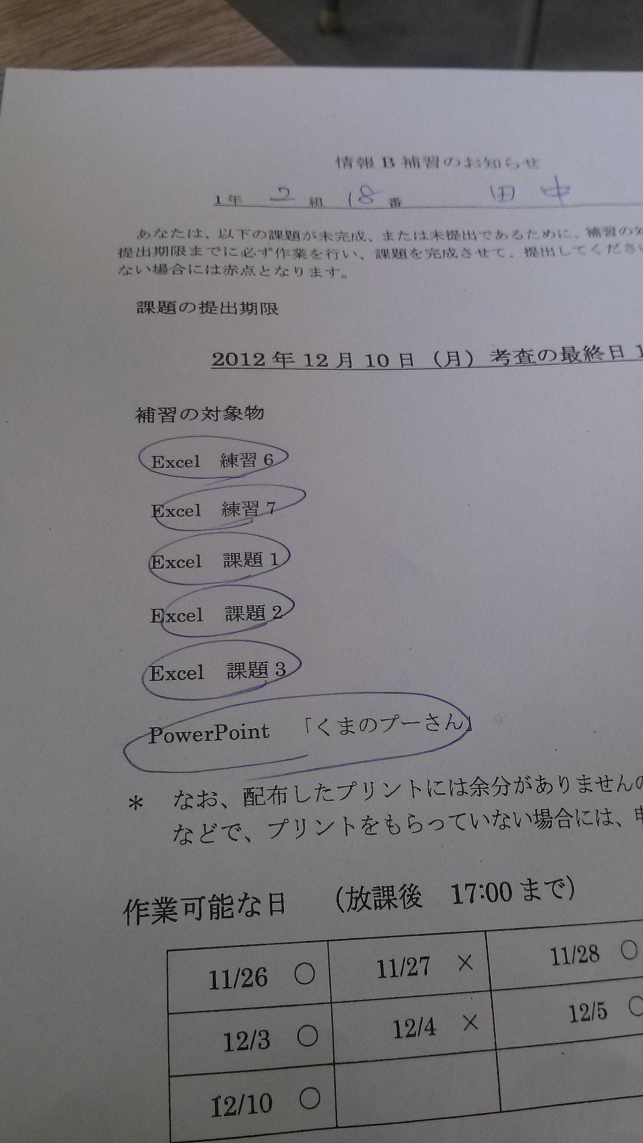 補習のお知らせ、ちゃんと「田中」の名字がありました(笑)