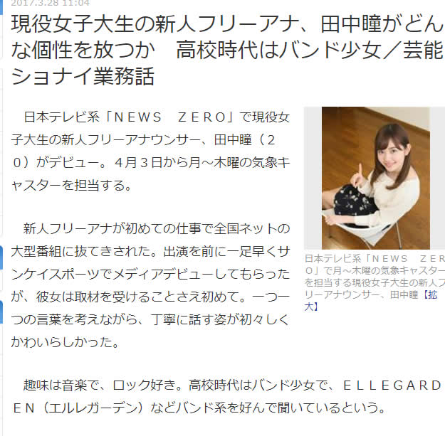 写真もいくつかアップされており、今の田中瞳アナとは似ても似つかぬ感じですが…